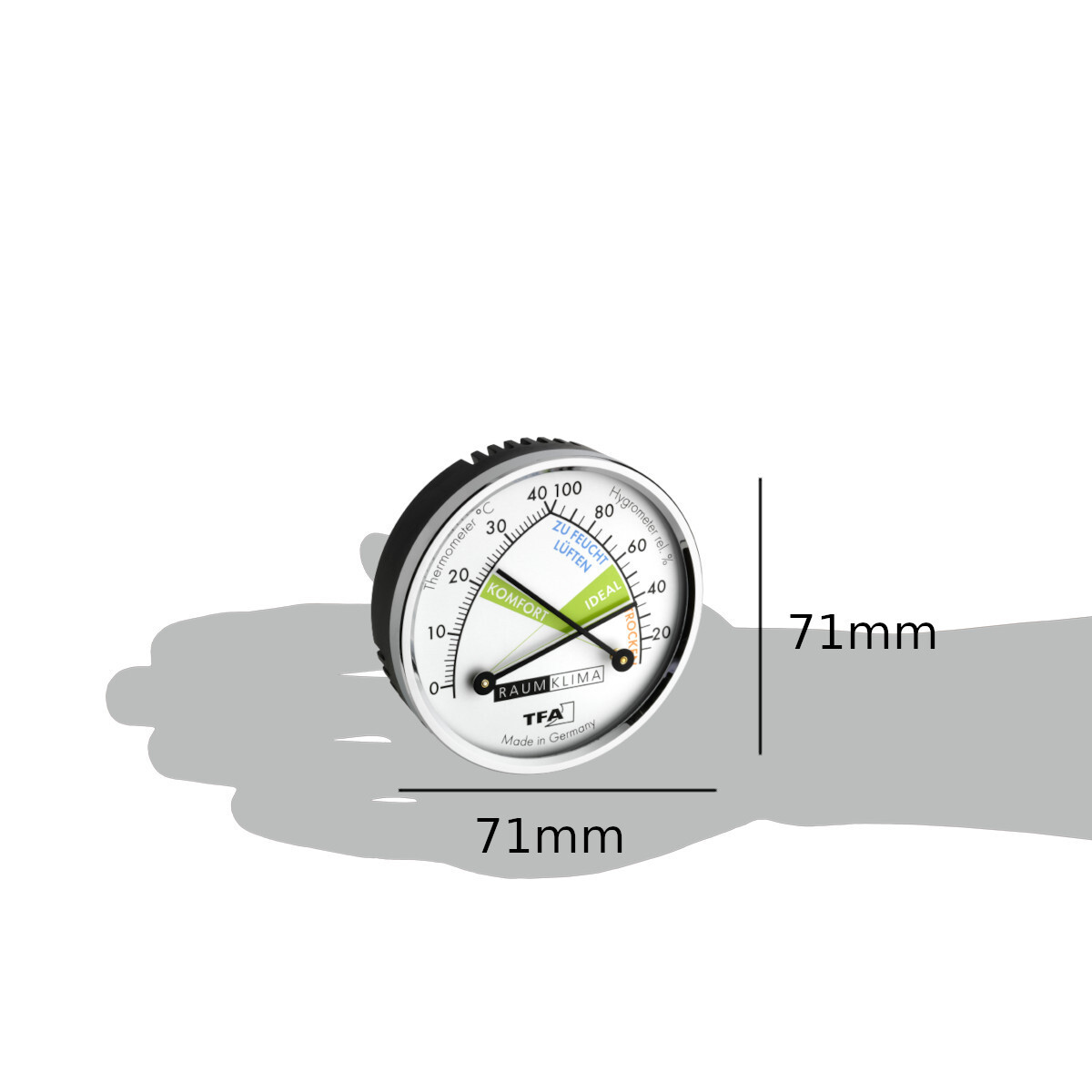 Ob wir uns zuhause wohl und behaglich fühlen, hängt in hohem Maße von der Qualität der Raumluft ab. Das Thermo-Hygrometer mit präzisem Haar-Synthetik-Werk ist ein ideales Instrument zur Überwachung des Raumklimas. Temperatur und Luftfeuchtigkeit können Sie einfach im Blick behalten und durch gezieltes Heizen und Lüften regulieren, wenn die Werte außerhalb der farblich gekennzeichneten Komfortzonen liegen. So schaffen Sie sich ein angenehmes und gesundes Wohnklima und sparen sogar Heizkosten. Einfach aufhängen oder mit dem integrierten Standfuß aufstellen. Das Gerät wird komplett in Deutschland gefertigt. Funktionen Zur Kontrolle von Innentemperatur und Luftfeuchtigkeit für ein gesundes Wohnklima Mit farbigen Komfortzonen Präzises Haar-Synthetik-Hygrometer Glasabdeckung Integrierter Standfuß Benötigt keine Batterien Geschütztes TFA-Design Hergestellt in Deutschland Technische Daten Lieferumfang Thermo-Hygrometer, Bedienungsanleitung Material Kunststoff Montage Zum Hängen oder Stellen Abmessungen (L) 120 x (B) 37 (68) x (H) 120 mm Gewicht 104 g