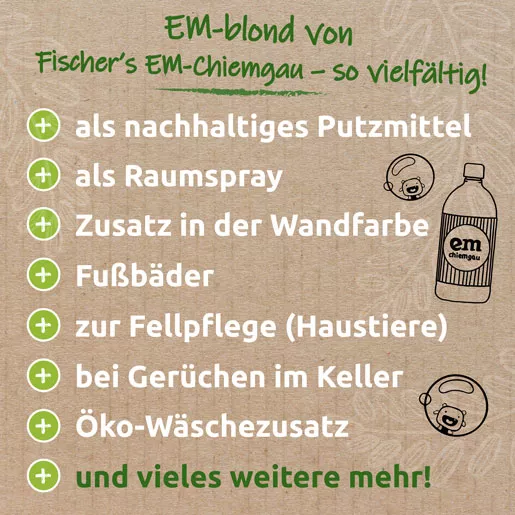 Die Mikroben-Mischung wirkt regenerativ, dominant, antioxidativ und erhält somit vielfältiges positives Wirkspektrum. EM-blond wird als umfassendes Hausmittel eingesetzt. EM-blond Anwendungen verschaffen ein positiv aufbauendes Milieu auf den behandelten Oberflächen und ein wohltuendes Raumklima.