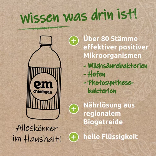 Die Mikroben-Mischung wirkt regenerativ, dominant, antioxidativ und erhält somit vielfältiges positives Wirkspektrum. EM-blond wird als umfassendes Hausmittel eingesetzt. EM-blond Anwendungen verschaffen ein positiv aufbauendes Milieu auf den behandelten Oberflächen und ein wohltuendes Raumklima.