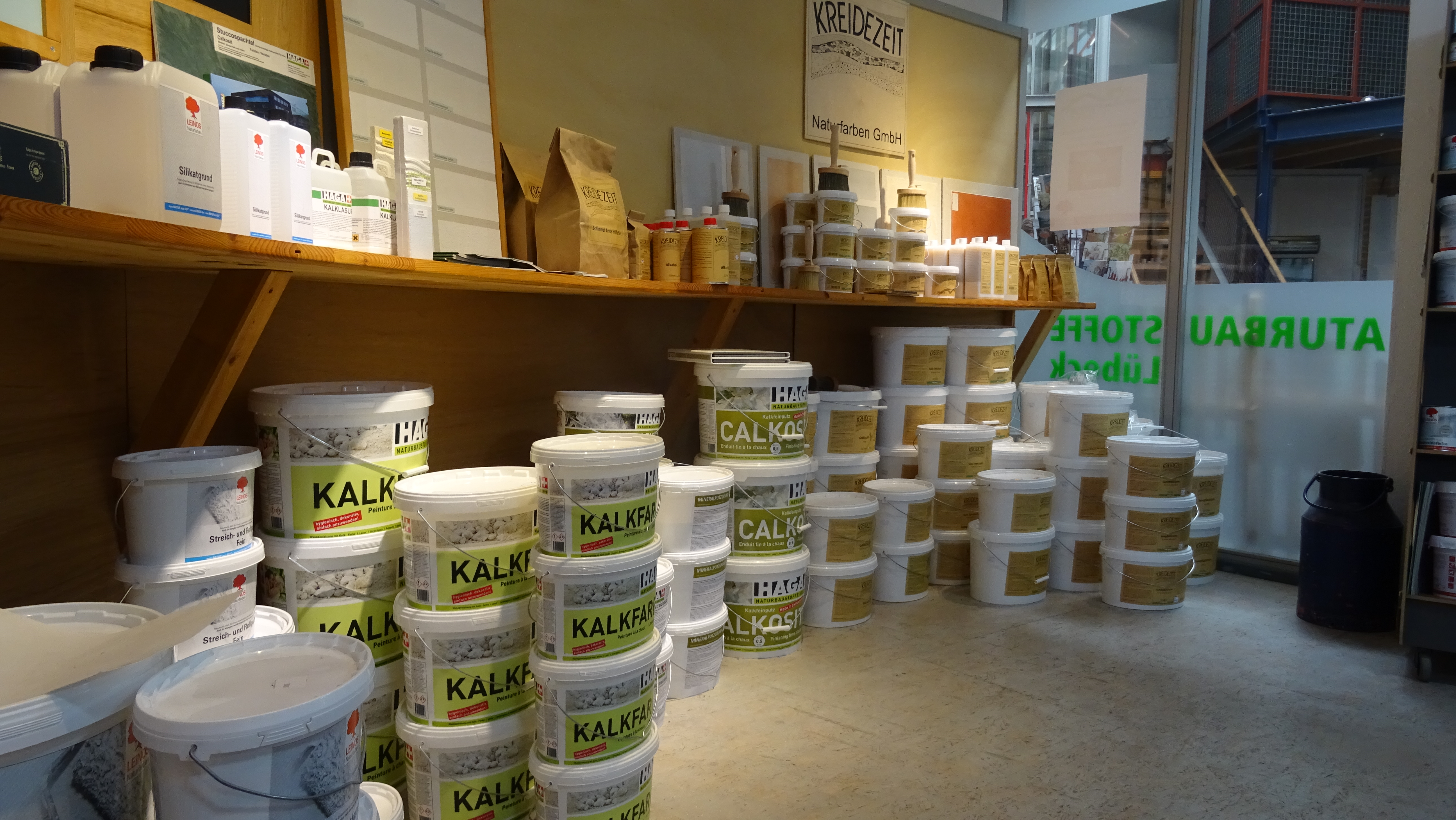 Kaseinfarbe zum Selbstanrühren ist eine Wand- und Deckenfarbe für den Innenbereich. Sie wird durch die Zugabe von Speisequark selbst hergestellt. Produktinformatione Kaseinfarbe zum Selbstanrühren Sicherheitsdatenblatt Kaseinfarbe Selbstanrühren Grundierung Alle Putze, Spachtelmassen, gespachtelte Trockenbauplatten, Beton und alte Dispersionsfarben mit Vega Grundierung oder Kaseingrundierung vorstreichen und vollständig austrocknen lassen. Papiervlies/Papiertapeten nicht grundieren. Anrühren der Farbe Benötigt werden: 2500 g Magerquark, ein leerer 10 Liter Eimer, ein 5 Liter Eimer oder Rührschüssel, Bohrmaschine mit Quirl, Rührholz oder Küchenmixer. 1) Farbbeutel öffnen und die kleine rote Tüte mit Soda entnehmen.2) 2,5Liter kaltes Wasser in den großen Eimer füllen, das weiße Farbpulver (7kg) zugeben3) kräftig mit Bohrmaschine und Quirl verrühren und 2 Stunden stehen lassen.4) Soda (rote Tüte im Farbbeutel) in ca. 200 ml heißem Wasser auflösen.5) 2500 g Magerquark in den kleinen Eimer geben, die Sodalösung dazugießen, gründlich mit Rührholz oder Mixer verrühren und 2 Stunden stehen lassen. In dieser Zeit wird das Kasein von der Soda aufgeschlossen.6) Quarkmischung in den großen Eimer mit dem Farbsumpf gießen und kräftig mit Bohrmaschine und Quirl verrühren. Die Farbe ist nun verarbeitungsfertig. Verarbeitung Verarbeitungstemperatur mind. 8°C. Während der Verarbeitung gelegentlich aufrühren. Für volle Deckfähigkeit sind in der Regel 2 Anstriche erforderlich. Nicht versuchen, dunkle und kontrastreiche Untergründe mit einem Anstrich zu überdecken; zu hohe Auftragsstärken können zu Anstrichschäden führen! Vorangegangene Anstriche vor dem Überstreichen vollständig austrocknen lassen. Während der Verarbeitung ist die Farbe durchscheinend, erst nach der Trocknung erreicht sie ihre volle Deckfähigkeit. Streichen Mit einer Fassadenbürste gleichmäßig im Kreuzschlag verstreichen. Rollen Zunächst satt und gleichmäßig im Kreuzgang auftragen, sofort anschließend ohne weiteren Materialauftrag in eine Richtung abrollen. Trockenzeit bei Normalklima Überstreichbar nach ca. 8 Stunden. Durchgetrocknet nach ca. 24 Std. Geeignete Werkzeuge Gute mittelflorige Farbrollen (Polyamid) und Streichbürsten. Empfohlen aus dem KREIDEZEIT Sortiment: Fassaden Streichbürste, Kalk Streichbürste, Profi Farbwalzen Reinigung der Werkzeuge Sofort nach Gebrauch mit Wasser. Reichweite pro Anstrich 40 m² Verbrauch pro m² 0,18 kg Genauer Verbrauch ist am Objekt zu ermitteln.